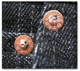 オリジナルリベットは「銭形」(ゼニガタ)江戸時代に、最もポピュラーであった貨幣「寛永通宝」をモチーフに「サムライ」の文字を刻んだ。
