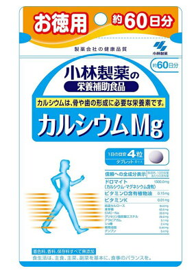 <小林製薬>カルシウムMg カルシウムは、骨や歯の形成に必要な栄養素です!! <カルシウムMgの特長> カルシウム・マグネシウム・ビタミンDなど配合 着色料、香料、保存料すべて無添加 <カルシウムMgの原材料> ドロマイト、麦芽糖、ショ糖、植物油脂、デンプン/結晶セルロース、糊料(CMC-Na)、グリセリン脂肪酸エステル、アラビアガム、ビタミンK、ビタミンD <カルシウムMgのお召し上がり方> 栄養機能食品として1日4粒を目安に、かまずに水またはお湯とともにお召し上がりください。
