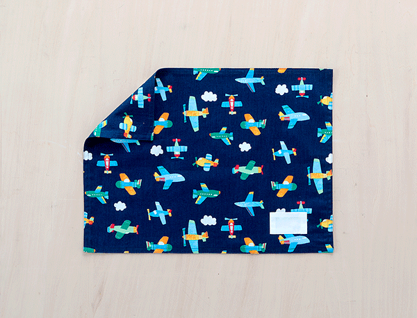 ランチョンマット(ランチクロス) 名札(氏名票)つき縦30cm横40cm雲とひこうき 紺813裏は共布